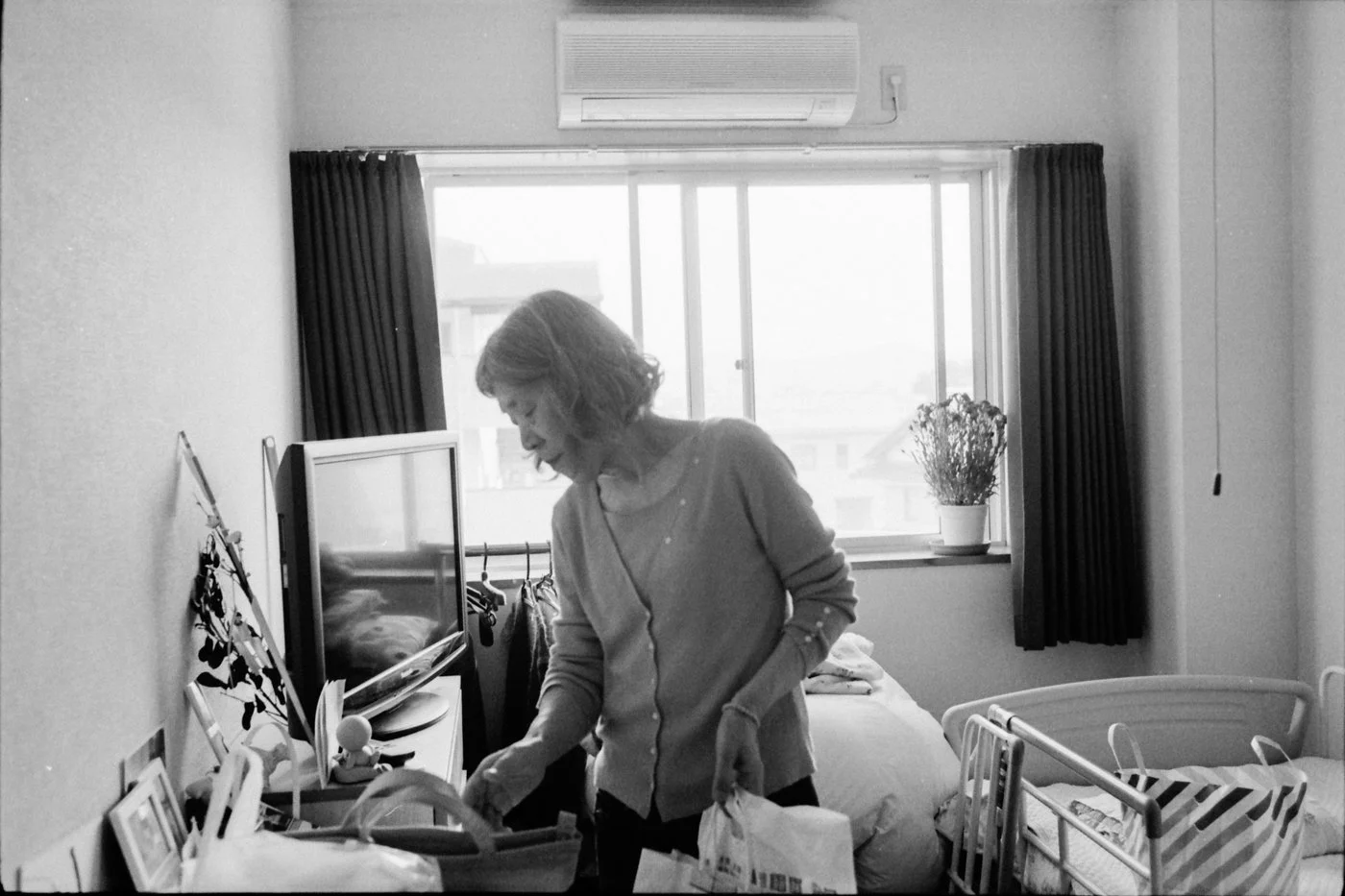 In 2012, Tsuyajyo moved to a care home where she would stay for the next seven years. I started photographing this series around that time as well. While my mother passed her responsibilities to the caregivers, she would visit her mother every few days to spend half an hour there, as if it were her duty, saying, “I just wish for her to laugh once a day.” Tsuyajyo gradually became calmer, and singing her original lines became her favorite activity. I was often amazed by her laughter. I was surprised when she gripped my hand more strongly than I expected, saying, “I want to grip your hand tightly until my blood vessels burst!”